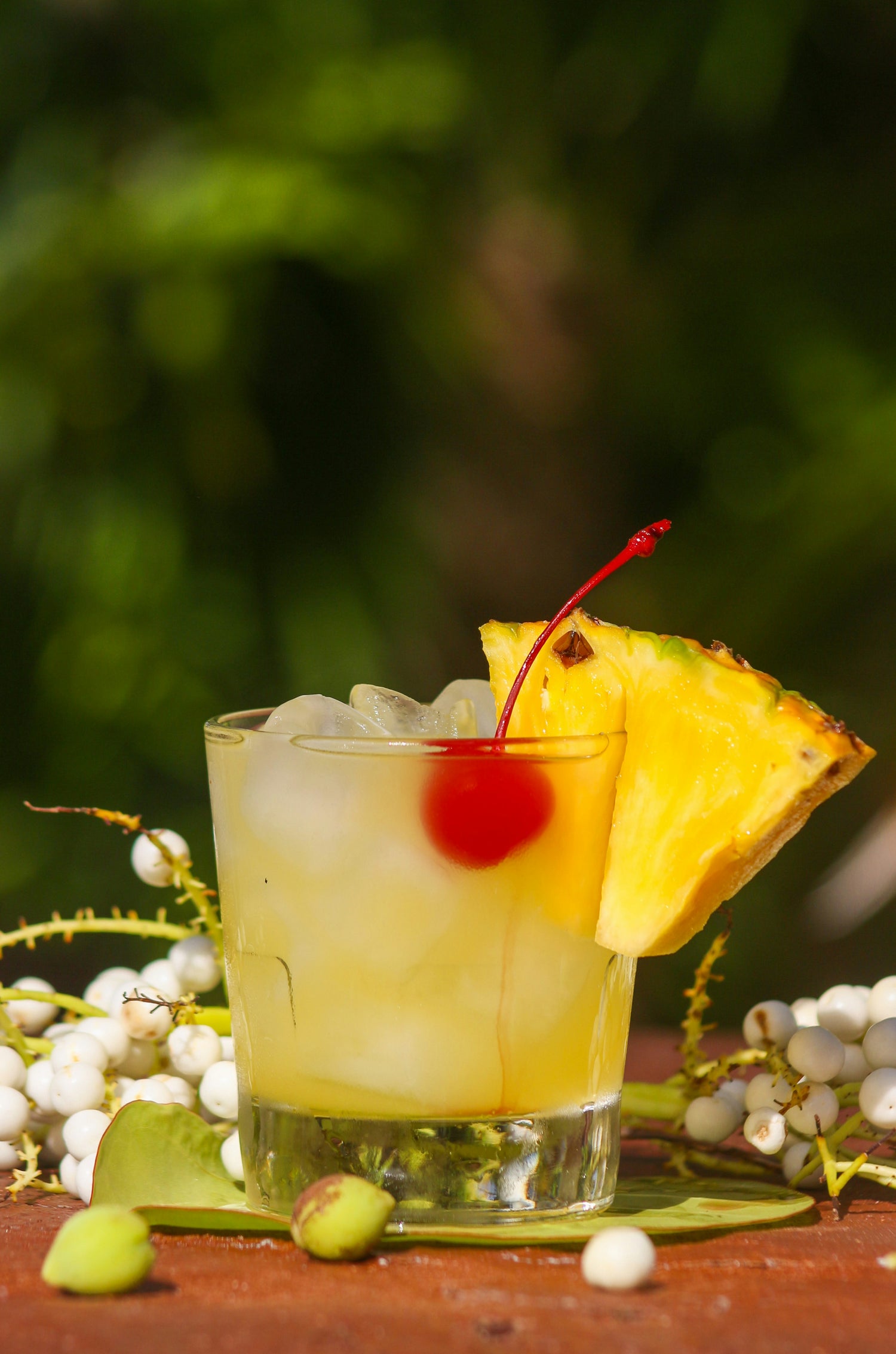 A tropical-meets-autumn old fashioned. Pineapple brightness, sweet potato warmth, and spice depth — rich, cozy, and golden.